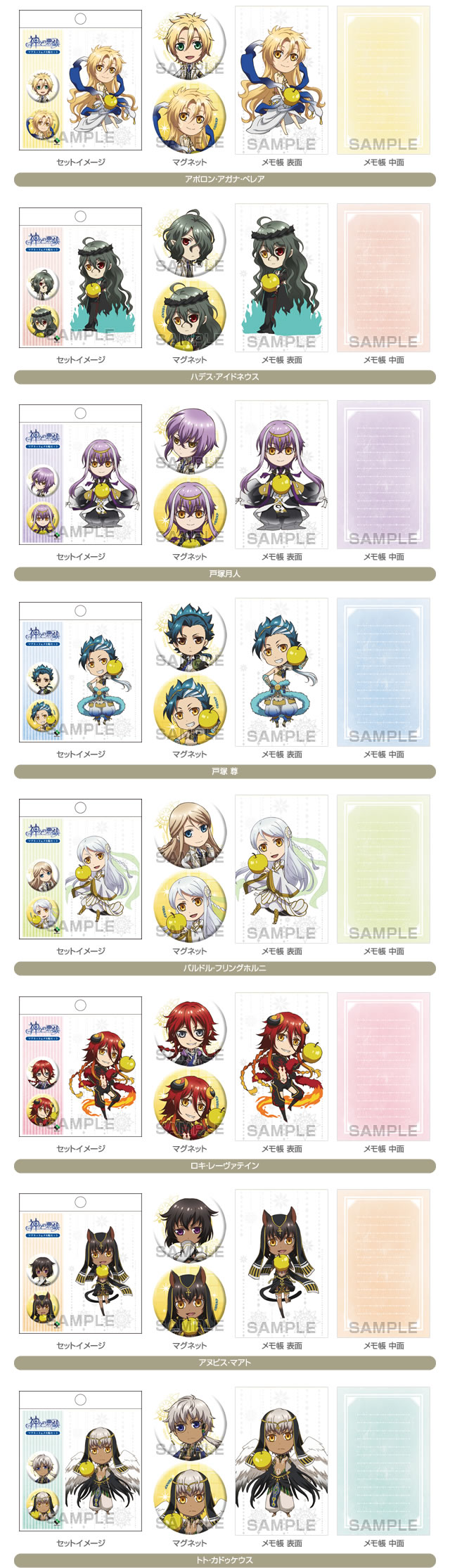 | 種類数 | 全8種「アポロン・アガナ・ベレア」「ハデス・アイドネウス」「戸塚月人」「戸塚 尊」「バルドル・フリングホルニ」「ロキ・レーヴァテイン」「アヌビス・マアト」「トト・カドゥケウス」 |
